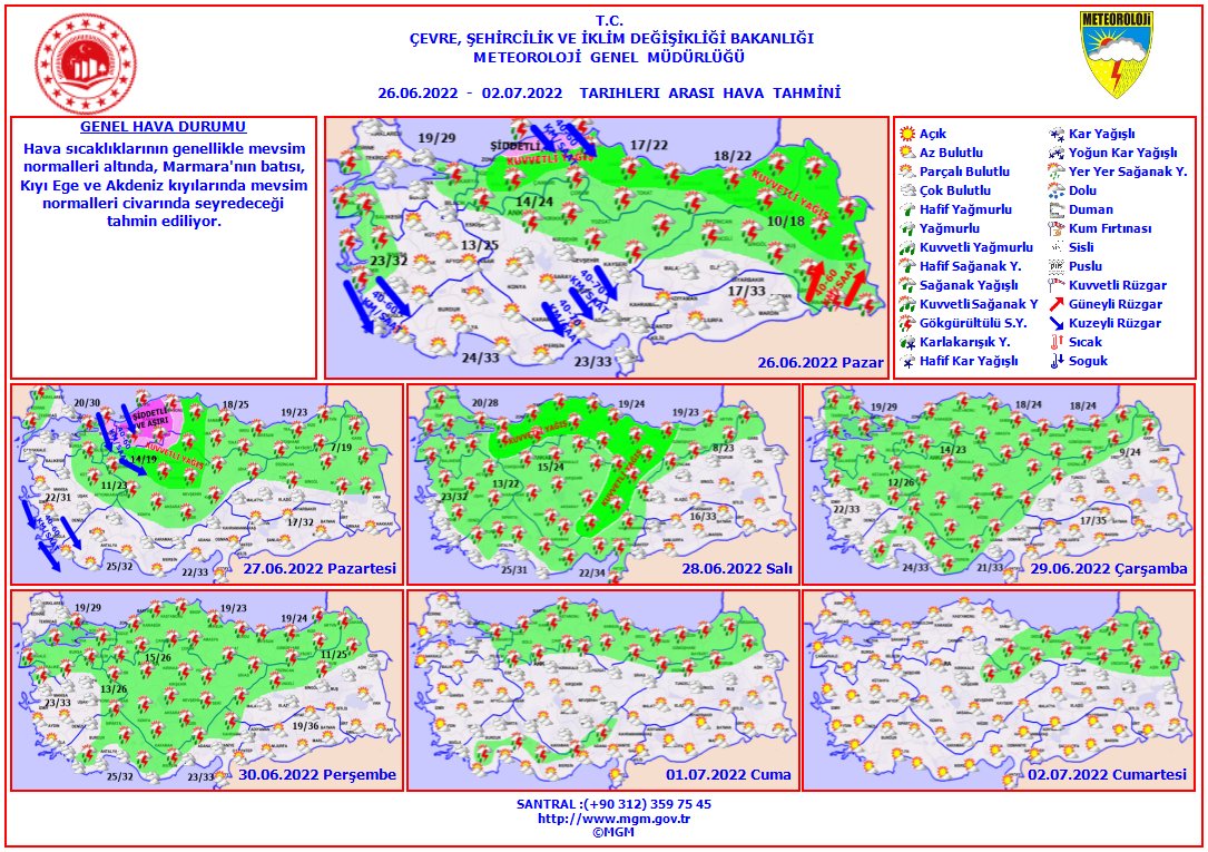 Meteoroloji Genel Müdürlüğü tarafından yapılan son değerlendirmelere göre, yurdun kuzey ve iç kesimlerinin parçalı yer yer çok bulutlu, Karadeniz, İç Anadolu'nun doğusu, Doğu Anadolu'nun kuzey ve doğusu, Kocaeli, Sakarya, Ankara, Çankırı, Denizli ve Aydın'ın iç kesimleri ile sabah saatlerinde Çanakkale, Edirne, Balıkesir'in batısı, İzmir'in kuzey ve iç kesimlerinin yerel olmak üzere sağanak ve gök gürültülü sağanak yağışlı geçeceği tahmin ediliyor.