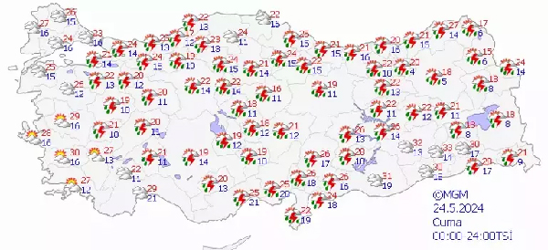 Meteoroloji Genel Müdürlüğü tarafından 24 Mayıs hava durumu tahminleri açıklandı. Yapılan son değerlendirmelere göre, ülkemiz genelinin parçalı, yer yer çok bulutlu, Marmara'nın doğusu ve Trakya, İç Ege, Doğu Akdeniz, Batı Akdeniz’in iç kesimleri, İç Anadolu, Batı Karadeniz in iç kesimleri, Orta ve Doğu Karadeniz, Doğu Anadolu ve Güneydoğu Anadolu Bölgesi'nin batısı, Zonguldak ve Düzce çevrelerinin sağanak ve gök gürültülü sağanak yağışlı geçeceği tahmin ediliyor. Yağışların, Ege'nin doğusu, (Konya ve Karaman hariç) İç Anadolu, Batı ve Orta Karadeniz’in iç kesimleri ile Doğu Anadolu'nun kuzeyi ve Isparta, Adana, Osmaniye ile Kahramanmaraş'ın batısında yerel kuvvetli, Hatay çevrelerinde çok kuvvetli olması bekleniyor. Doğu ve Güney Doğu Anadolu'nun doğusunda toz taşınımı bekleniyor.