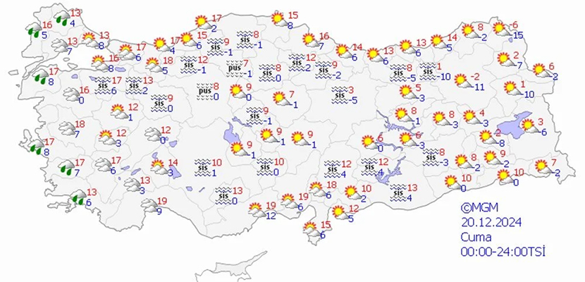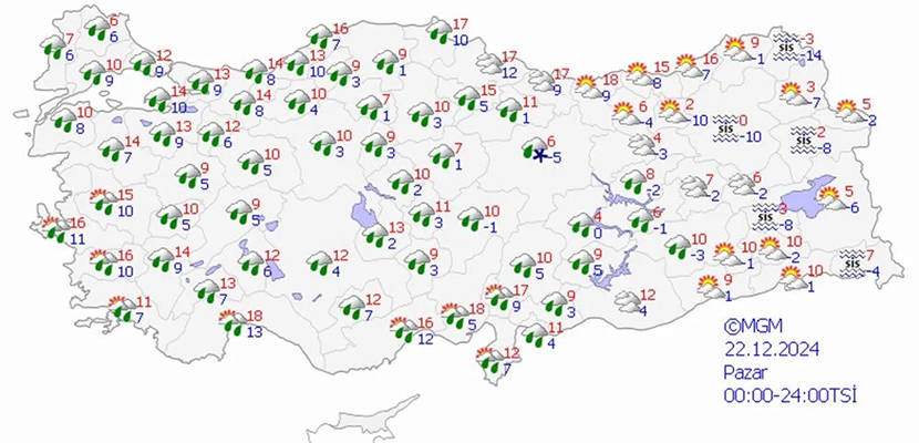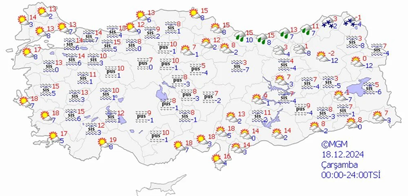 Meteoroloji Genel Müdürlüğü (MGM), 18 Aralık 2024 tarihine ilişkin hava durumu raporunu yayınladı.