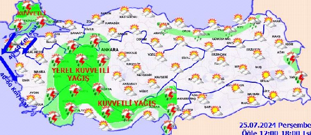 Meteoroloji Genel Müdürlüğü olarak yapılan değerlendirmelere göre, yurt genelinde parçalı ve yer yer çok bulutlu, Trakya, İç Ege, İç ve Doğu Akdeniz, İç Anadolu’nun batısı, Doğu Karadeniz'in iç ve yüksek kesimleri, Çanakkale, Bilecik, Bolu ve Ordu çevreleri ile Van'ın kuzey ve doğu kesimlerinin yerel sağanak ve gök gürültülü sağanak yağışlı geçeceği tahmin ediliyor. Yağışların; İç ve Doğu Akdeniz, İç Anadolu’nun batısı, İç Ege, Edirne, Kırklareli ve Karaman çevreleri ile Hatay kıyılarında yerel kuvvetli olması bekleniyor.