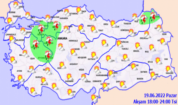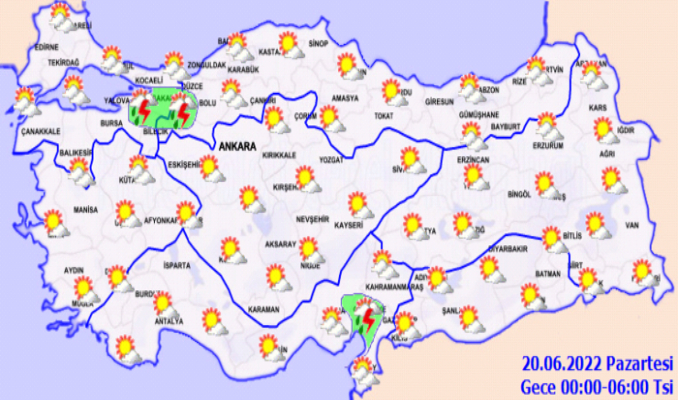 Meteoroloji Genel Müdürlüğü tarafından yapılan son değerlendirmelerine göre, yurdumuzun kuzey ve iç kesimlerinin parçalı ve yer yer çok bulutlu, Marmara'nın doğusu, İç Ege, Doğu Akdeniz'in Toroslar mevki, İç Anadolu'nun kuzeybatısı, Batı Karadeniz (Sinop hariç), Doğu Karadeniz'in iç kesimleri ile Kırklareli, İstanbul'un kuzey kesimleri, Isparta, Osmaniye, Hatay kıyıları, Rize, Artvin, Kars ve Ardahan çevrelerinin yerel olmak üzere sağanak ve gök gürültülü sağanak yağışlı, diğer yerlerin az bulutlu ve açık geçeceği tahmin ediliyor.