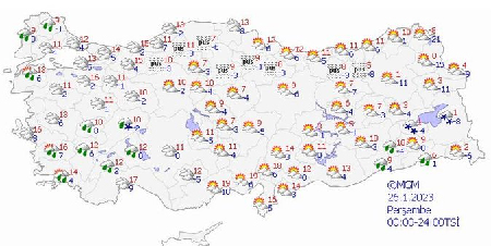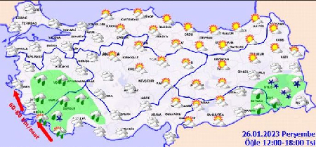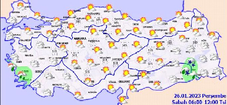 Meteoroloji Genel Müdürlüğü tarafından yapılan son değerlendirmelere göre ülkemiz genelinin parçalı, yer yer çok bulutlu, Marmara'nın batısı, (Kütahya hariç) Ege, Batı Akdeniz ile Bitlis, Şırnak, Van, Siirt ve Batman çevrelerinin yağışlı geçeceği tahmin ediliyor.