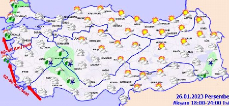 Ege'de rüzgarın, bugün öğle saatlerinden sonra güney ve güneydoğu, Kuzey Ege'nin kuzeyi kuzeydoğu yönlerden 6 ila 8 kuvvetinde (50-75 km/sa) fırtına, yer yer 9 kuvvetinde (90 km/sa) kuvvetli fırtına şeklinde eseceği tahmin ediliyor.