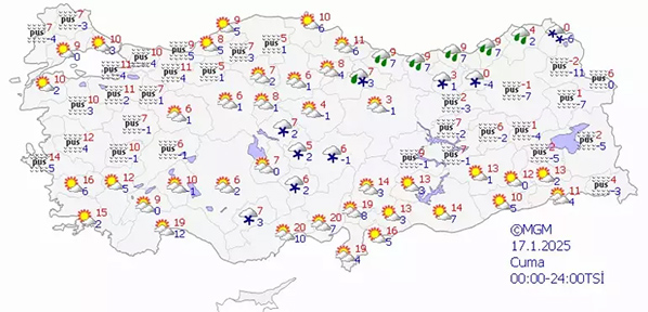 Meteoroloji Genel Müdürlüğü'nün son verilerine göre, yurdun kuzey, iç ve doğu kesimlerinin parçalı ve çok bulutlu, Doğu Karadeniz kıyıları ile Ordu çevrelerinin yağmur ve sağanak yağışlı, Doğu Karadeniz’in iç kesimleri ile Kayseri, Kırşehir, Niğde, Nevşehir, Aksaray, Karaman, Tokat ve Ardahan çevrelerinin karla karışık yağmur ve kar yağışlı, diğer yerlerin az bulutlu ve açık geçeceği tahmin ediliyor. Ülkemizin iç ve doğu kesimlerinde buzlanma ve don ile birlikte pus ve yer yer sis bekleniyor.