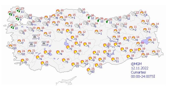 Meteoroloji Genel Müdürlüğü tarafından yapılan son değerlendirmelere göre: ülkemizin batı ve kuzey kesimlerinin parçalı, yer yer çok bulutlu, Orta Karadeniz kıyıları ile Kırklareli, Edirne, Tekirdağ, Çanakkale ve İstanbul'un Karadeniz kıyılarının yağmur ve sağanak yağışlı geçeceği tahmin ediliyor. İç ve kuzey kesimlerde sabah ve gece saatlerinde pus, yer yer sis bekleniyor.