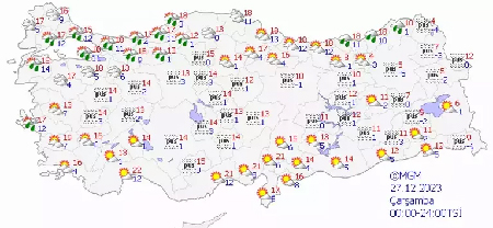 Meteoroloji Genel Müdürlüğü tarafından yapılan son değerlendirmelere göre, ülkemizin kuzeydoğusu ile zamanla batı kesimlerinin parçalı yer yer çok bulutlu, bu gece saatlerinden itibaren Kuzey Ege kıyıları İzmir ve Çanakkale çevreleri ile bugün (Çarşamba) öğle saatlerinden sonra Aydın'ın kıyı kesimleri, Balıkesir'in kuzey ve batısı, Tekirdağ, İstanbul, Kocaeli, Sakarya, Yalova, Bolu, Zonguldak, Düzce, Bartın ve Karabük çevrelerinin yerel olmak üzere yağmur ve sağanak yağışlı geçeceği tahmin ediliyor. Bu gece ve bugün (Çarşamba) sabah saatlerinde iç ve doğu kesimlerde yer yer pus ve sis hadisesi bekleniyor. Kar yağışı ise ülke genelinde beklenmiyor.