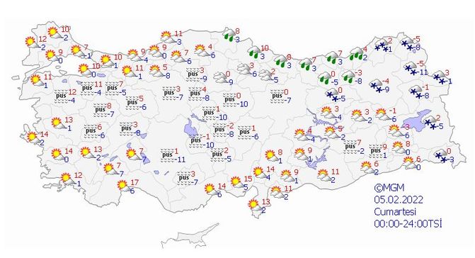 TRABZON: 7, Çok bulutlu, doğu ilçelerinde kuvvetli olmak üzere yağmur ve sağanak, iç kesimleri karla karışık yağmur ve yüksekleri kar yağışlı.