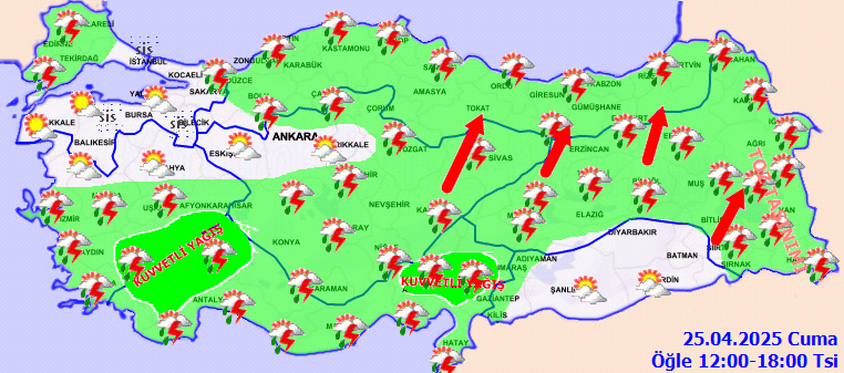 Meteoroloji Genel Müdürlüğü tarafından yapılan tahminlere göre: Ülkemiz genelinin parçalı ve çok bulutlu, Ege, Akdeniz, İç Anadolu, Karadeniz, Doğu ve Güneydoğu Anadolu ile Edirne, Tekirdağ, Kırklareli, Sakarya çevreleri ve Bilecik'in doğu kesimlerinin sağanak ve gök gürültülü sağanak yağışlı geçeceği tahmin ediliyor. Yağışların; Denizli, Isparta, Burdur, Antalya'nın iç ve doğusu, Kahramanmaraş’ın batısı, Osmaniye ve Adana’nın kuzeyi, Erzurum’un güneyi, Muş ve Bingöl’ün kuzeyi ile Tunceli’nin doğusunda yerel kuvvetli olması bekleniyor. Rüzgarın; İç Anadolu’nun kuzeydoğusu, Doğu Anadolu, Güneydoğu Anadolu'nun doğusu, Doğu Karadeniz'in iç kesimlerinde güneyli yönlerden kuvvetli olarak (40-60 km/saat), Doğu Anadolu'nun güneydoğusunda (60-90 km/saat ) fırtına şeklinde esmesi bekleniyor. Sabah ve gece saatlerinde Marmara ile Karadeniz kıyılarında pus ve sis olayı bekleniyor. Doğu Anadolu'nun güneydoğusunda toz taşınımı görüleceği tahmin ediliyor.