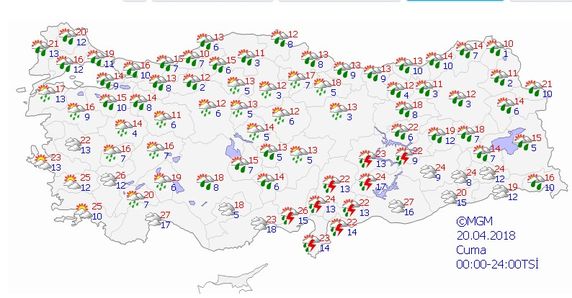 Meteoroloji hava durumu raporunu yayınladı. Yayınlanan hava durumu raporunda öğle saatlerinden itibaren Doğu Karadeniz ve Doğu Anadolu'nun kuzeydoğusu ile Erzincan, Tunceli, Bingöl ve Muş çevreleri ve gece saatlerinden itibaren Marmara'nın kuzeybatısı ile Konya çevrelerinin aralıklı ve yerel olmak üzere sağanak yağışlı geçeceği belirtildi. Ayrıca yarın için tüm bölgeler için yağış uyarısı yapıldı. İşte Meteoroloji 19 Nisan hava durumu ve detaylar...