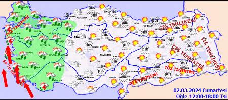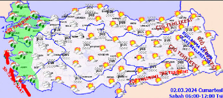 Marmara ve Güneydoğu Anadolu'da toz taşınımı bekleniyor. İç ve doğu kesimlerde pus ve yer yer sis, doğu kesimlerde buzlanma ve don olayı görüleceği tahmin ediliyor. Doğu Karadeniz’in iç kesimleri ile Doğu Anadolu’nun kuzey ve doğusunda çığ tehlikesi bulunmaktadır.