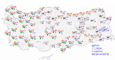 Meteoroloji Genel Müdürlüğü tarafından yapılan son tahminlere göre ülkemizin batı kesimlerinin parçalı ve yer yer çok bulutlu, Marmara, Ege, Batı Akdeniz ile Eskişehir, Bolu ve Düzce çevrelerinin sağanak ve yer yer gök gürültülü sağanak yağışlı, diğer yerlerin az bulutlu ve açık geçeceği tahmin ediliyor.