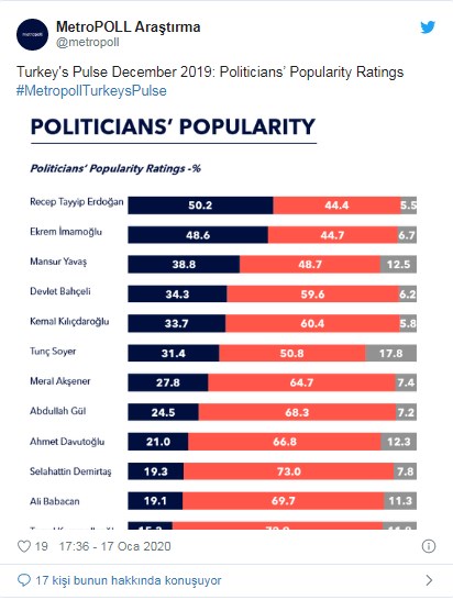 MetroPOLL Araştırma'nın popülerlik anketinde dikkat çeken bir başka unsur ise Cumhur ittifakı ortağı ve MHP Genel Başkanı Devlet Bahçeli'nin yüzde 34.3'lük beğenilme oranı ile dördüncü sırada yer alması.