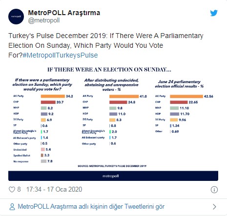 Aralık 2019'da düzenlenen anketin sonuçlarına göre iktidardaki AK Parti yüzde 34.2 ile birinci sırada. AK Parti'yi yüzde 20.7'lik oy oranı ile CHP takip ediyor.