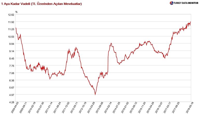 Merkez Bankası'nın verilerine göre 1 aya kadar Türk Lirası cinsi mevduatlarda ortalama faiz 18 Mayıs haftası itibariyle yüzde 11,92 seviyesine çıktı. Böylelikle Mart 2009'dan bu yana bu faizlerde en yüksek seviye kaydedildi.