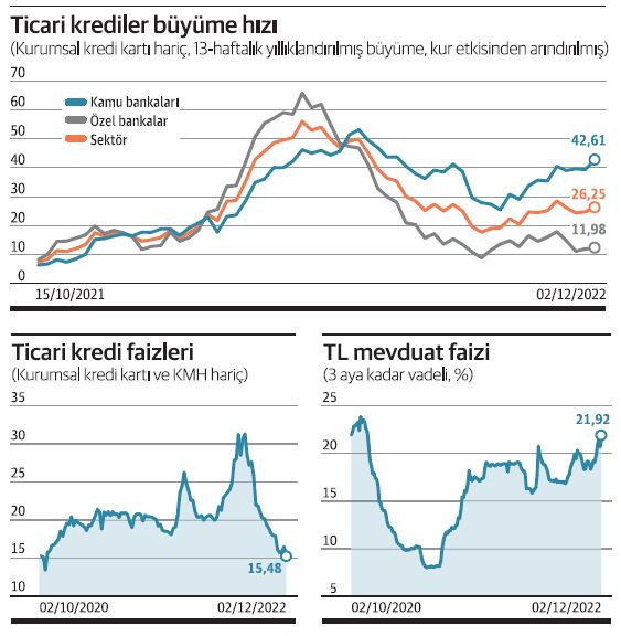 Kamu bankalarında da makroihtiyati önlemlerin ardından 13 haftalık yıllıklandırılmış kur etkisinden arındırılmış ticari kredi büyümesi yüzde 25'lere kadar gerilese de eylüldeki faiz indirimi sonrasında ivmesi arttı. 2 Aralık haftasında ise ticari kredi büyüme hızı yüzde 42,61 ile temmuzda makroihtiyati önlemler öncesindeki seviyeyi yakaladı. Özel bankalar ise kamu bankalarının aksine ticari kredi büyümesinde hız kesti. Özel bankaların 13 haftalık yıllıklandırılmış ticari kredi büyümesi 2 Aralık haftası itibariyle yüzde 11,98 oldu. Haziranda yüzde 47'ye varan büyüme hızı hızla yavaşladı.