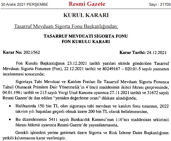 Tasarruf Mevduatı Sigorta Fonu (TMSF), bankalardaki mevduat ile katılım bankalarındaki katılım fonu için TMSF garantisi üst limitini, 150 bin TL'den 200 bin TL'ye çıkardı.