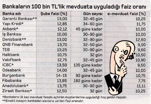 Bugün küçük ölçekli bankalarda 100 bin TL'si bulunan mudilere verilen mevduatın faiz oranı yüzde 14-15 bandında yoğunlaşırken, çok şubeli büyük bankaların faiz oranları ise ağırlıklı olarak yüzde 12.50-13.50 bandında oluştu. Ancak para tutarı arttıkça faiz oranlarını yukarı çeken bankalar da var. Bazılarında 500 bin TL ve üzeri, bazı bankalarda ise 1 milyon TL ve üzerinde mevcut faiz oranlarına ek yarım ve üzeri faiz veriliyor. Bu nedenle bu özel durumlarda mevduata uygulanan faiz yüzde 15'leri de aşıyor.