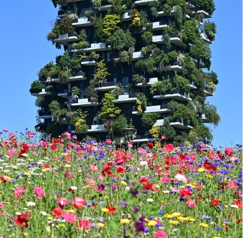 Milano'nun Porta Nuova semtinin merkezinde yer alan Bosco Verticale binaları üzeri ve çevresinde toplamda 21 bin ağaç, çiçek ve uzun ömürlü yeşil bitkiler bulunuyor.