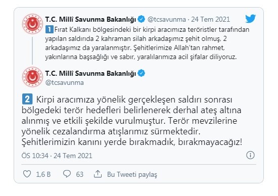 MSB'den yapılan açıklamada, "Saldırı sonrası bölgedeki terör hedefleri belirlenerek derhal ateş altına alınmış ve etkili şekilde vurulmuştur. Terör mevzilerine yönelik cezalandırma atışlarımız sürmektedir. Şehitlerimizin kanını yerde bırakmadık, bırakmayacağız" denildi.