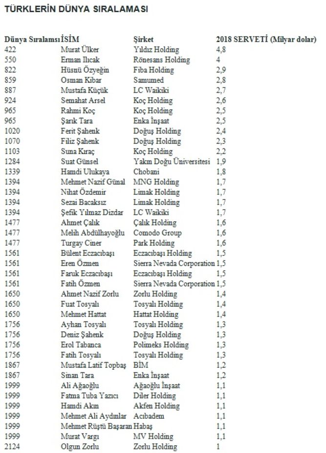 4,8 milyar dolarlık servetiyle Türkiye’nin en zengin ismi olan Murat Ülker dünya sıralamasında 422’inci oldu. İlk 500’de yer alan tek Türk olan Ülker’i, 4 milyar dolarlık servetiyle Türkiye’nin en zengin ikinci ismi Erman Ilıcak dünyada 550’inci sırada yer alarak izledi. Hüsnü Özyeğin, Osman Kibar, Mustafa Küçük, Rahmi Koç, Semahat Arsel ve Şarık Tara ise dünyanın en zengin ilk 1000 milyarderi arasında yer aldı. Listede 1 milyar dolarlık servete sahip olan isimler Türk milyarder Olgun Zorlu ile birlikte 2124’üncü sırada yer aldı. Bu yıl ilk kez dünya milyarderleri arasında yer alan Tosyalı Holding’in patronu Fuat Tosyalı 1,4 milyar dolarlık servetiyle listeye 1650’inci sıradan girdi. Kardeşleri Ayhan ve Fatih Tosyalı ise 1,3 milyar dolarla 1756’ıncı sırayı paylaştı. Ayrıca Polimeks İnşaat’ın kurucusu Erol Tabanca da 1,3 milyar dolarlık servetiyle 1756’ıncı sırayı paylaşan isimlerden oldu.
