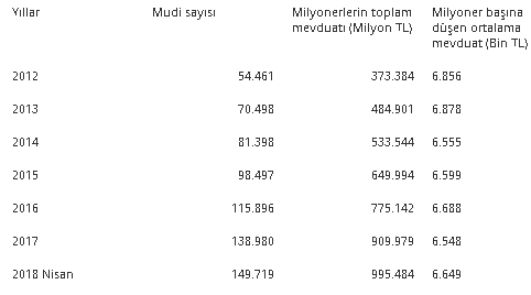 Yıllara göre hesabında 1 milyon lira ve üzeri bakiye olan mudi sayısı, toplam mevduatları ve milyoner başına düşen ortalama mevduat tutarı şöyle: