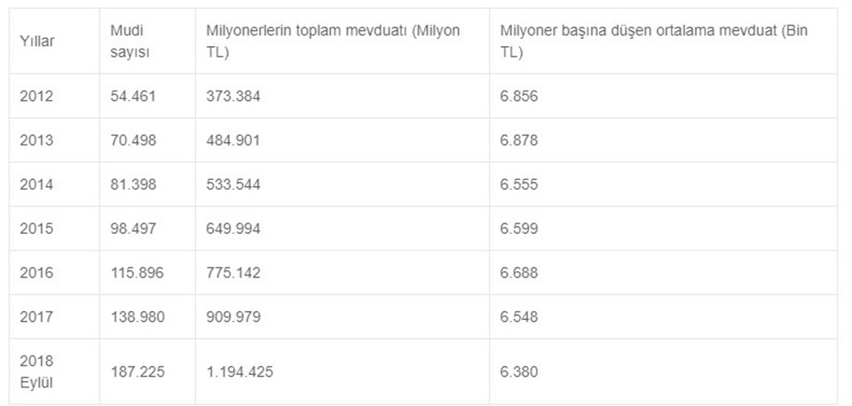 Söz konusu milyonerlerin toplam mevduatı eylül sonu itibarıyla 1 trilyon liranın üzerine çıkarak 1 trilyon 194 milyar 425 milyon liraya ulaştı. Böylece milyoner başına düşen ortalama mevduat, 6 milyon 380 bin lira oldu.