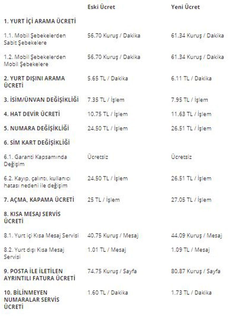 Habertürk’ün haberine göre; BTK'nın kurul kararı uyarınca ayrıca numara ve SIM kart değişikliği, hat devir, açma/kapama, ayrıntılı fatura ile bilinmeyen numaralar servisleri için sunulan ücretlerin azami tutarları da yükseltildi.