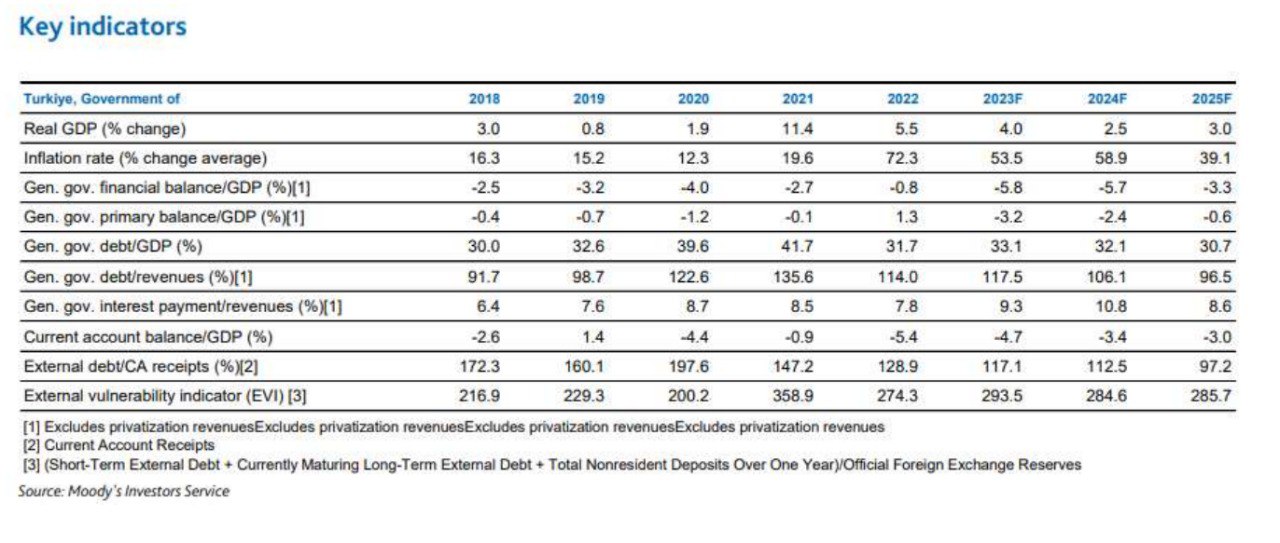 Moody's Türkiye ekonomisinin 2023'te yüzde 4,0, 2024'te yüzde 2,5 ve 2025'te yüzde 3,0 büyümesini beklerken, ortalama enflasyonun 2023'te yüzde 53,5, 2024'te yüzde 58,9 ve 2025'te yüzde 39,1 olacağını öngördü. Türkiye'nin cari işlemler açığının GSYH'ye oranının 2023'te yüzde 4,7, 2024'te yüzde 3,4 ve 2025'te yüzde 3,0 olacağını tahmin etti.