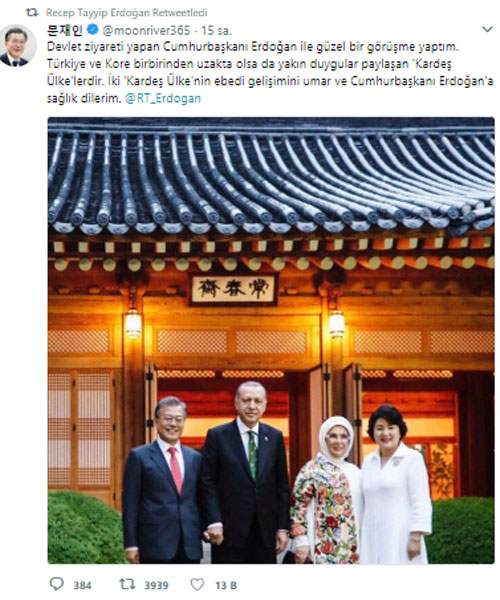 Cumhurbaşkanı Erdoğan, Moon Jae-in'in bu tweetini retweet yaptı.