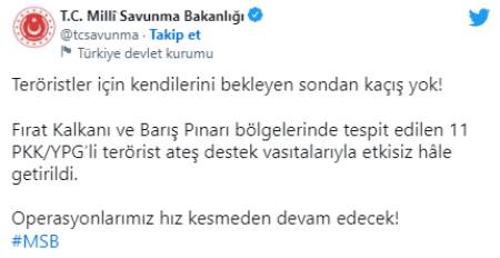 Hain terör örgütü PKK'ya yönelik mücadele sürüyor. Son olarak Fırat Kalkanı ve Barış Pınarı bölgelerinde tespit edilen 11 PKK/YPG’li terörist ateş destek vasıtalarıyla etkisiz hâle getirildi.