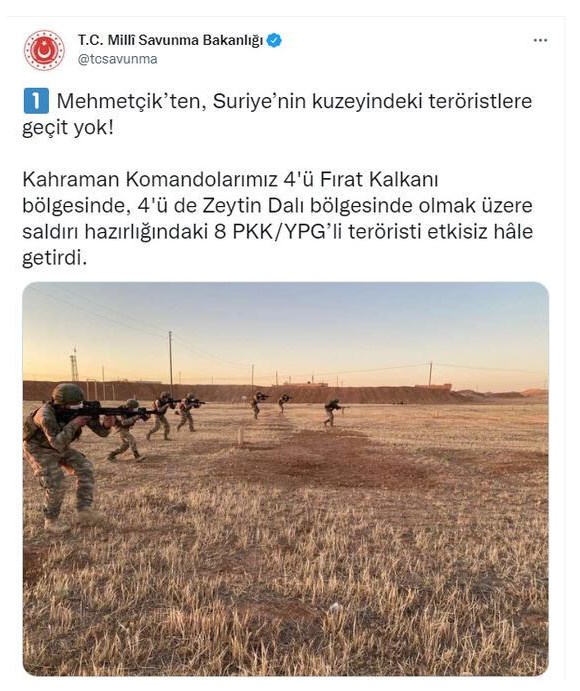 MSB, yaptığı paylaşımda, “Mehmetçik’ten, Suriye’nin kuzeyindeki teröristlere geçit yok! Kahraman Komandolarımız 4'ü Fırat Kalkanı bölgesinde, 4'ü de Zeytin Dalı bölgesinde olmak üzere saldırı hazırlığındaki 8 PKK/YPG’li teröristi etkisiz hâle getirdi” dedi.