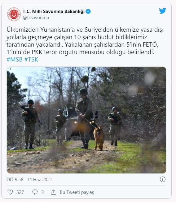 Bakanlıktan yapılan açıklamada ''Ülkemizden Yunanistan’a ve Suriye’den ülkemize yasa dışı yollarla geçmeye çalışan 10 şahıs hudut birliklerimiz tarafından yakalandı. Yakalanan şahıslardan 5’inin FETÖ, 1’inin de PKK terör örgütü mensubu olduğu belirlendi'' denildi.