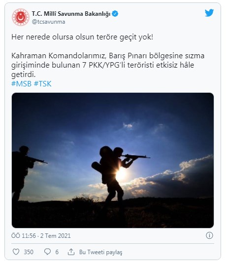 Bakanlıktan yapılan açıklamada ''Her nerede olursa olsun teröre geçit yok. Kahraman Komandolarımız, Barış Pınarı bölgesine sızma girişiminde bulunan 7 PKK/YPG’li teröristi etkisiz hâle getirdi'' denildi.