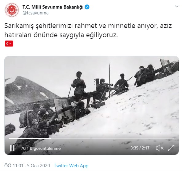 Bakanlığın Twitter hesabından,'Sarıkamış şehitlerimizi rahmet, minnet ve saygıyla anıyor, aziz hatıraları önünde saygıyla eğiliyoruz' başlıklı paylaşımda bulunuldu.