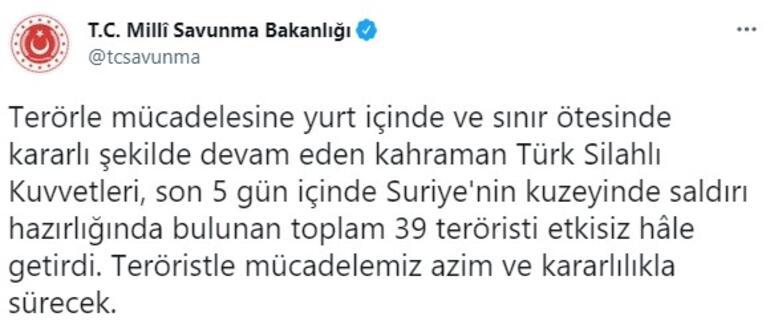 MSB'den yapılan açıklamada, "Terörle mücadelesine yurt içinde ve sınır ötesinde kararlı şekilde devam eden kahraman Türk Silahlı Kuvvetleri, son 5 gün içinde Suriye'nin kuzeyinde saldırı hazırlığında bulunan toplam 39 teröristi etkisiz hâle getirdi. Teröristle mücadelemiz azim ve kararlılıkla sürecek." denildi.