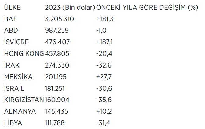 Mücevher sektörünün en fazla ihracat gerçekleştirdiği ülke 3 milyar 205 milyon 310 bin dolarla Birleşik Arap Emirlikler (BAE) olurken, 987 milyon 259 bin dolarla ABD ikinci ve 476 milyon 704 bin dolarla İsviçre üçüncü sırada yer aldı.