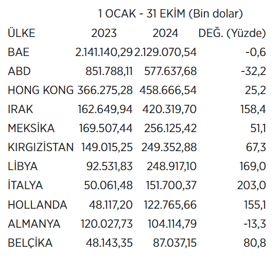 Mücevher sektörünün yılın 10 ayında en çok ihracat yaptığı ülkeler şöyle: