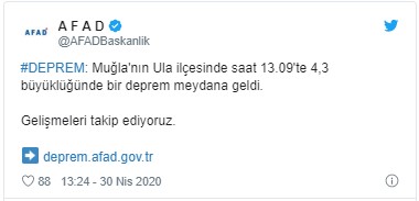 Kandilli'nin verilerine göre Muğla'nın Ula ilçesinde saat 13.09'da 4,5 büyüklüğünde bir deprem meydana geldi. AFAD ise depremin büyüklüğünü 4,3 olarak açıkladı.