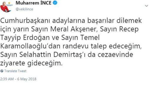 Cumhurbaşkanı adaylarına başarılar dilemek için yarın Sayın Meral Akşener, Sayın Recep Tayyip Erdoğan ve Sayın Temel Karamollaoğlu’dan randevu talep edeceğim, Sayın Selahattin Demirtaş’ı da cezaevinde ziyarete gideceğim.