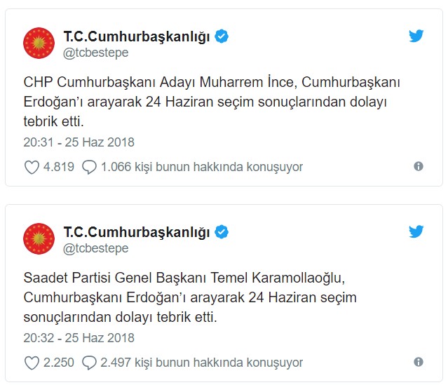 Türkiye Cumhuriyeti Cumhurbaşkanlığı Twitter hesabından ''CHP Cumhurbaşkanı Adayı Muharrem İnce, Cumhurbaşkanı Erdoğan’ı arayarak 24 Haziran seçim sonuçlarından dolayı tebrik etti'' şeklinde paylaşım yapıldı.