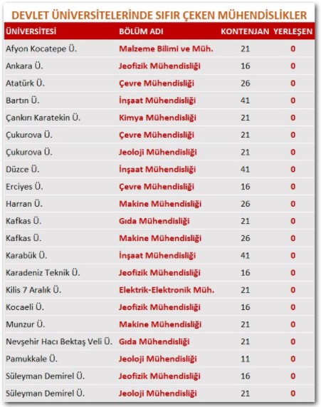 Bir dönemin gözde bölümleri olan makine ve inşaat mühendisliğinin de bu bölümler içersinde olması dikkat çekti.