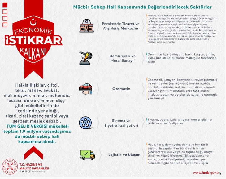 Koronavirüs (COVID-19) salgınının neden olduğu ekonomik tahribata karşı devreye aldığımız Ekonomik İstikrar Kalkanı tedbirleri kapsamında vergi süreçleri bakımından mücbir sebep hükümlerinden faydalanacak mükellefler için bir Genel Tebliğ hazırladık.