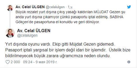 Ülgen, "Büyük rezalet, yurt dışına çıkış yasağı kaldırılan Müjdat Gezen şu anda yurt dışına çıkamıyor çünkü pasaportu iptal edilmiş. Sabiha Gökçen’de pasaportuna el konuldu ve geri dönüyor" ifadelerini kullandı.