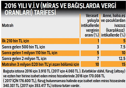 Öncelikle şunu belirtelim: Büyüklerin sağlığında da, Allah geçinden versin vefatında da çocuklara geçen mallar vergiye (VİV) tabi. Yalnız; vefat sonrası çocuklara (ve eşe) miras yoluyla intikallerde, vergi oranı bağış yoluyla intikale göre daha düşük. Ayrıca vefat sonrası mirasçılara geçen mallar için istisnalar daha yüksek. Vefat sonrası intikal için vergi oranları yüzde 1’den başlayıp, malların değerinin artmasıyla birlikte yüzde 3, yüzde 5, yüzde 7 ve yüzde 10’a kadar yükseliyor. Bağış yoluyla çocuklara geçen mallarda ise oran yüzde 5’den başlayıp yüzde 15’e kadar çıkıyor. Her iki durumda tabloda yer almakta.