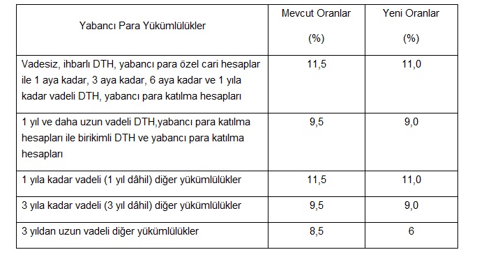 Bu çerçevede, piyasaya döviz likiditesi sağlamak ve aynı zamanda bankacılık sistemimizin yabancı para yükümlülüklerinin vadelerinin uzamasını teşvik etmek amacıyla yabancı para zorunlu karşılık oranları aşağıdaki şekilde yeniden belirlenmiştir: