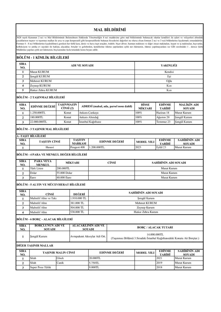 Mal bildiriminde ayrıca, Murat Kurum'un 200 bin Türk lirası ile 55 bin dolar ve 40 bin Euro'ya sahip olduğu belirtilirken, eşi Şengül Kurum'un 1 milyon 910 bin lira değerinde muhtelif altın ve takıya sahip olduğu bilgisi de yer alıyor. Mal bildirim belgesinde Murat Kurum adına kayıtlı iki silah bir de tüfek bulunuyor.