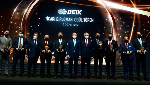 Ticaret Bakanı Mehmet Muş, Dış Ekonomik İlişkiler Kurulu (DEİK) Başkanı Nail Olpak ve DEİK İş Konseyi Başkan ve Yürütme Kurulu Üyelerinin katılımıyla ticari diplomasinin en iyilerine 6 kategoride 12 ödülün takdim edildiği DEİK Ticari Diplomasi Ödül Töreni İstanbul Lütfi Kırdar Kongre Merkezi'nde gerçekleştirildi.