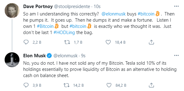 Musk, söz konusu açıklamayı komedyen Dave Portnoy'un Tesla CEO'sunu Bitcoin'i açıkça destekleyerek fiyatının artmasını sağlamak ve daha sonra satış yaparak spekülatif kâr elde etmek ile suçlamasının ardından yaptı.