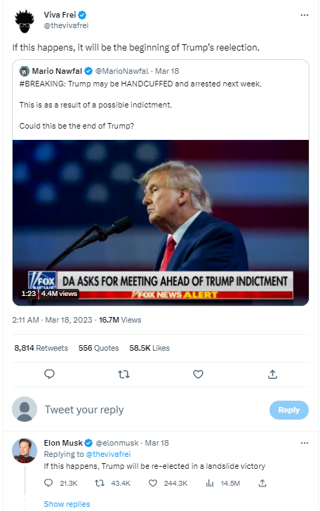 Trump ise buna rağmen, Musk'ın Twitter'ı almasını eleştirmişti. Eski ABD Başkanı'nın iddiasının nedeni 2016 başkanlık seçimi kampanyası sırasında ilişki yaşadığı iddia edilen porno yıldızı Stormy Daniels'a "sus payı ödediği" gerekçesiyle yürütülen soruşturma.