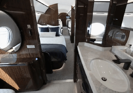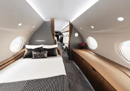 Gulfstream’e göre G700, iş jetleri arasında en büyük kabine sahip. Jetin sanal turunda, G700’ün kabini; tuvalet, mutfak, ön koltuk, eğlence süiti ve yemek alanı gibi çeşitli bölümlere ayrılmış. G700’ün en dikkat çekici özelliklerinden biri ise kamara.